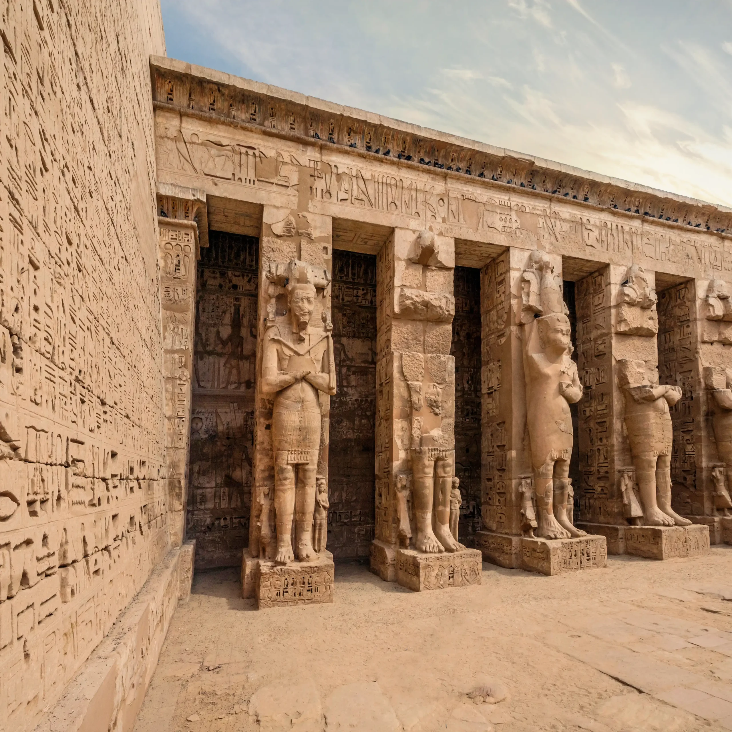 Although other structures are located within the area, the location is today associated almost exclusively with the Mortuary Temple of Ramesses III The temple, some 150m long, is of orthodox design, and resembles closely the mortuary temple of Ramesses II the Ramesseum temple
